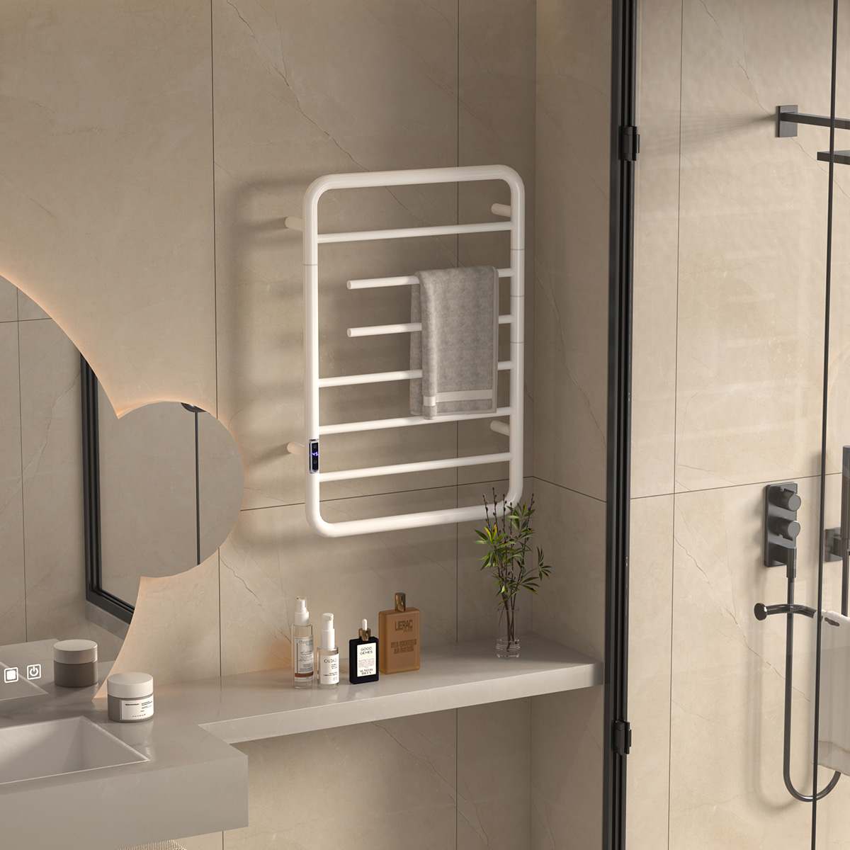 8桿時控開關電熱毛巾架 8 bar time switch heated towel rail 材質(zhì)Material:SS201/SS304 功率Power:220V/120W 表面Surface:White Painted 白色噴塑 尺寸Size:550*110*800mm 包裝Ctn size:570*130*830mm