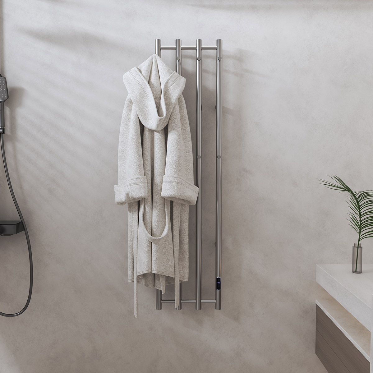 4桿時(shí)控開關(guān)電熱毛巾架 4 bar time switch heated towel rai 材質(zhì)Material:SS201/SS304 功率Power:220V/250W 表面Surface:Mirror Polished 鏡面拋光 尺寸Size:345*123*1405mm 包裝Ctn size:402*106*1470mm