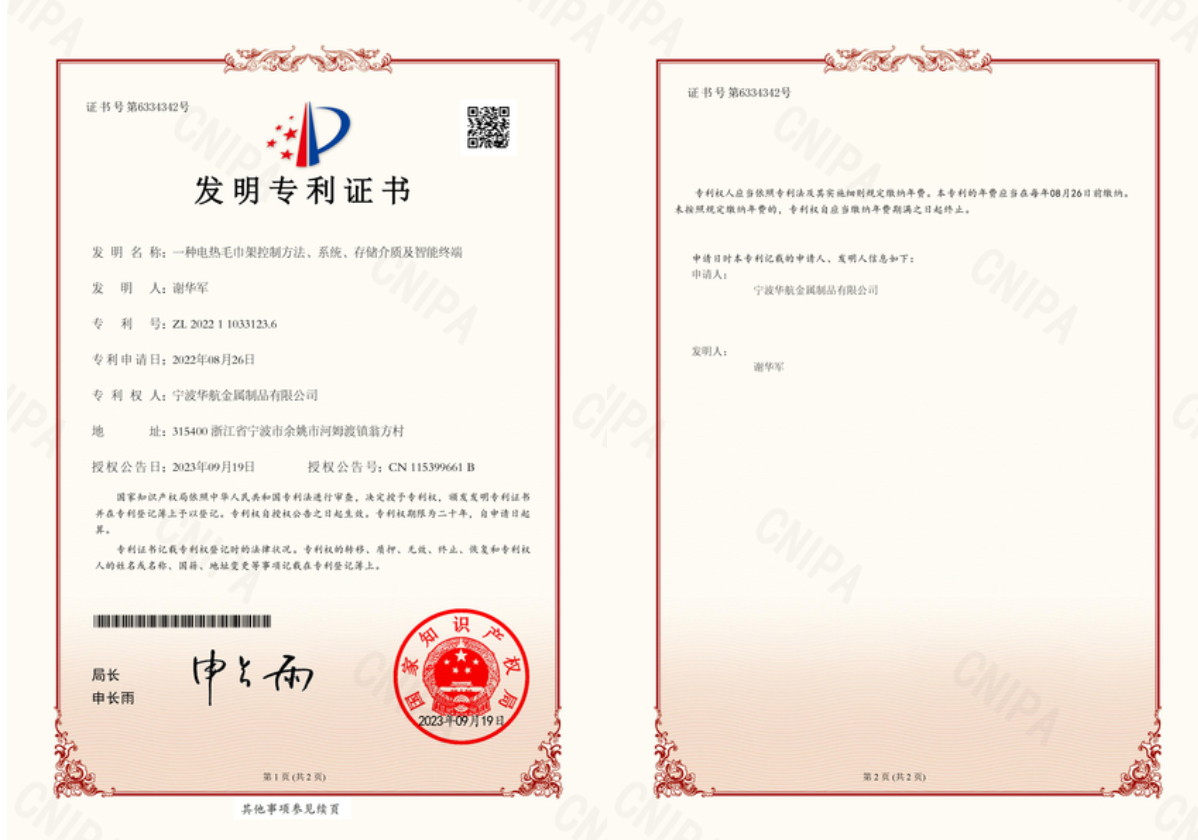 作為一家高新技術(shù)企業(yè),公司始終以“質(zhì)量求生存,創(chuàng)新促發(fā)展”為宗旨,積極開(kāi)展各項(xiàng)創(chuàng)新工作。截至目前,公司累計(jì)已申請(qǐng)并獲得國(guó)家知識(shí)產(chǎn)權(quán)局發(fā)明專(zhuān)利,實(shí)用新型專(zhuān)利及外觀(guān)設(shè)計(jì)專(zhuān)利等60余項(xiàng)。這些專(zhuān)利成果,意味著寧波華航在電熱毛巾架領(lǐng)域的創(chuàng)新成果得到認(rèn)可,為公司增強(qiáng)技術(shù)核心競(jìng)爭(zhēng)力,和公司的再發(fā)展提供了強(qiáng)有力的科技支撐